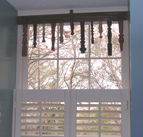 Here's an out of the ordinary window valance. Made by gluing old chair spindles etc onto a piece of trim.
