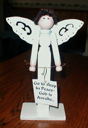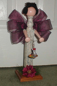 Toots made these 2 angels from old spindles. "one to hold sayings and one to hold favorite xmas ornament....one with wire ribbon wings and one with scroll-saw wings"