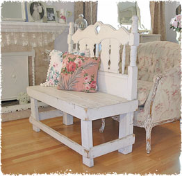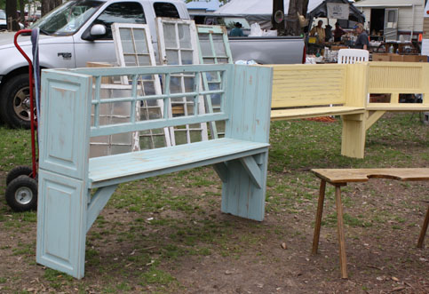 The Bench looks as if it's been made from old windows and shutters, or cabinet doors.