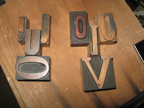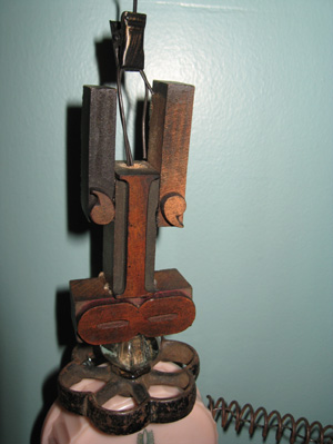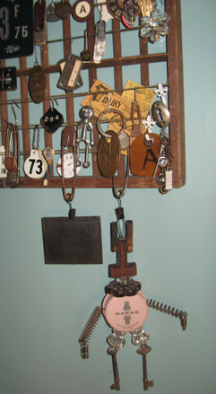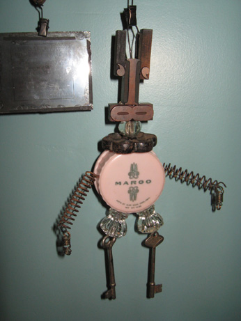 The I is the nose and the commas are the eyes. To make this cute doll. First I drilled 5 holes in the plastic container. The inspiration piece used tin containers either would work well. One hole center top for the head, 2 for the arms and 2 for the legs. Then I threaded wire through the holes and began to attach the different bits of junk for the arms, hands, and legs. For the head, I glued the pieces of letterpress together, then drilled through them and threaded the wire through and bent it into a hanging hook. A little glue here and there keeps things from sliding around, and that was it.