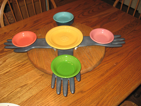 For the shelf: What I did was to take 2 of the forms, and I mounted them to a piece of scrap wood, screwing them in from the back. Then I placed 2 glass shelves on them, use a clear glue to set the shelves in place, and that's it. For the Lazy Susan: I've taken an existing Lazy Susan I had and added the forms to it. These could be glued down, or even screwed in. If you did not want to damage your Lazy Susan, you could mount the forms to wood pieces and then attach the pieces together in the center to make it strong, and then simply lay it on top of your Lazy Susan. Then I just added some bowls and a plate to the center (to cover the uglies) and that is it. What fun this would be for chips and dip. For the File Holder: This one is done the same way as the shelf project. Just add another hand in the middle. Be sure to countersink the screws so it will set level on your desk or table. And the other neat thing about these, is that you can write on them with chalk.