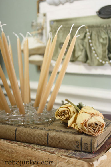 For this I simply added slim candles to an old glass flower frog. I wouldn't light them though without something fireproof to catch the drips. Metal Basket Cloche-by Margo