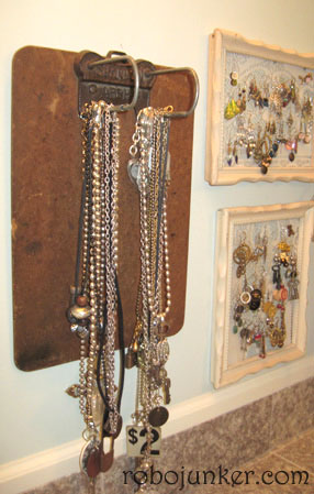 Use old hinges for all sorts of projects. Here I've added old hinges to a couple of frames and a "shoe stretcher wall hook" project, to add a little something extra. The one attached to the shoe stretcher is attached directly to the back and can be used to hang the item. The ones attached to my Earring Display frames, are simply attached to the wall and then the frames are hung to seem as if they are hung by the hinge.