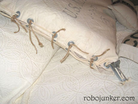 I knew immediately I wanted to turn them into pillows/ or cushions. First I washed them, I think one still needs a good soak in Vintage Textile Soak. ![]() I wanted to do these cushions/pillows without cutting the bags up or destroying them in any way. So I took the smaller one, stuffed it with 2 standard pillows. Tied the end grommets with jute. Kept the original industrial lacing mechanism in tact, and that is it. I now have a unique pillow for the guest room. I think the other will be for my swing outside. ![]() And when I'm tired of them, I can sell them in their original condition. Necklace organizer by Margo