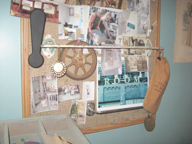 I added dimension by attaching 2 old towel bars to it. Now I can hang various trinkets as well as pin up clippings and ideas.