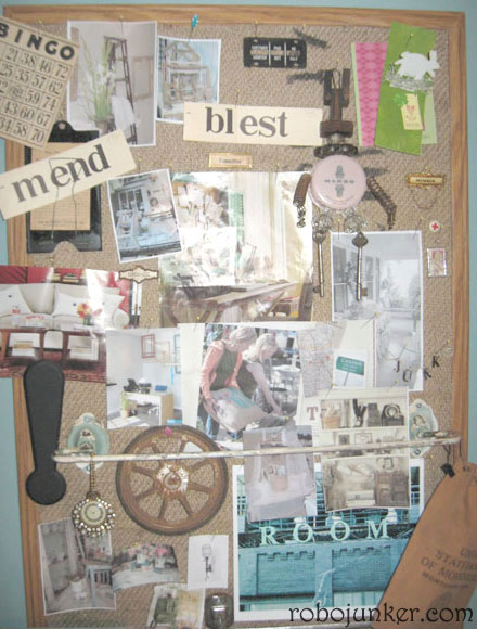 Burlap Covered Inspiration Board-By Margo Inspired by a bulletin board I saw in either Pottery Barn or Ballard Designs and one that was in an article in Flea Market Style Magazine, I decided to give an old cork board of mine a makeover. The cork on this board was messed up, because I had glued stuff to it and then removed it (along with some of the cork). So I covered it in burlap and made my very own inspiration board.